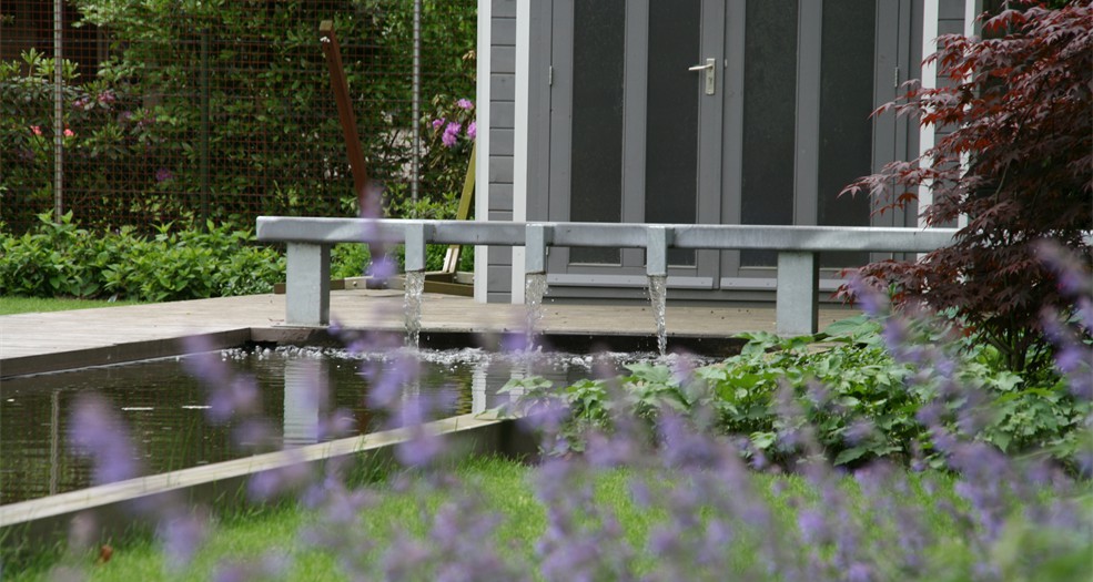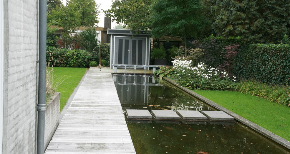 De vormgeving van de tuin sluit aan op de architectuur van de bungalow. Tegen het huis ligt het grote eetterras. Haaks hierop is een langgerekte vijver aangelegd met ’zwevende’ staptegels. Het vijvereinde bestaat uit een gecombineerd zit/waterelement. De verhoogde hardhouten vlonder leidt je langs de vijver naar het terras bij dit zitelement. Hier bevindt zich tevens de tuinberging voor gereedschap en tuinstoelen. De daar geplante trompetboom zal uiteindelijk schaduw geven. De gevarieerde fruitbomen in het gazon en de losse beplanting in de borders doorbreken de strakke lijnen in het ontwerp. De grote bloembakken met diverse beplanting staan verspreid door de tuin en zorgen voor extra groen.