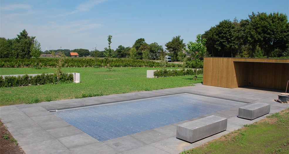 Deze villa bevindt zich 1,5m hoger dan de straat. Inpandig zijn verschillende tussenverdiepingen. Het hoogste terras, dicht bij de woning en voorzien van een overkapping, ligt op 2,5 m boven het straatniveau. De beplanting, bestaande uit bloeiende heesters met klein blijvende bomen, onttrekt het terras van de weg . Een blijvende garantie voor privacy. Elk van de drie plateaus heeft een eigen sfeer, zodat je de tuin steeds op een andere manier beleeft. Via een royale trap kom je op het niveau van het zwembad met poolhouse. Grote haagblokken en betonnen keerwanden markeren deze ruimte. Grote antraciet kleurige tegels geven hier rust aan het geheel. De opening tussen de hagen geeft je toegang tot het grote grasveld. Dit dient voornamelijk als speelveld voor de kinderen; er is ruimte voor een trampoline, speeltoestellen, maar ook om een partijtje te voetballen. Aan de voorzijde is een groot grindvlak gecreëerd. De buxuswolk geeft de voorzijde een groen uiterlijk.