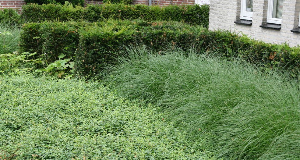 Een groene tuin was de opdracht. Daarom is veel gebruik gemaakt, van wintergroene beplanting zoals Taxus, klimop, Pachysandra, Carex en Buxus. De vijver sluit aan op de eetruimte in de woning. Vanuit hier is een zichtlijn gemaakt die eindigt bij een mooie solitaire boom die op termijn een schaduwplek gaat geven op het gazon. De taxushagen omarmen de vijver en versterken het gewenste beeld. Achter het huis ligt een royaal terras met zicht op de vijver. Een pad geeft verbinding met het tweede terras achter de bergruimte. Zo is er altijd iets te beleven of juist een rustpunt op te zoeken.